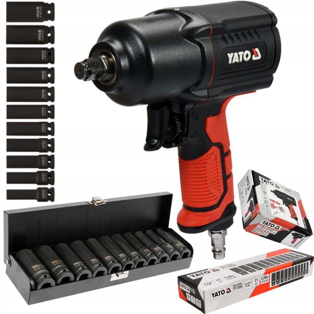 YATO YT-09544 to profesjonalny klucz pneumatyczny udarowy 1/2″ o maksymalnym momencie 1700 Nm, zaprojektowany do intensywnej pracy przy kołach, zawieszeniu i zapieczonych połączeniach śrubowych. Lekka, kompozytowa obudowa zmniejsza zmęczenie operatora, a jednocześnie zapewnia wysoką odporność na uszkodzenia mechaniczne. Klucz doskonale sprawdza się w serwisach oponiarskich i warsztatach samochodowych, gdzie liczy się szybkość oraz skuteczność działania. Zestaw uzupełniony o długie nasadki udarowe 1/2″ (11 szt., zakres 10–24 mm) wykonane ze stali CR-MO gwarantuje bezpieczne przenoszenie wysokiego momentu obrotowego, łatwy dostęp do głęboko osadzonych śrub oraz niezawodność nawet przy pracy ciągłej.